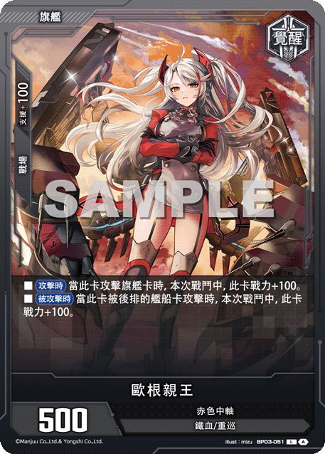 卡牌效果 ■將此卡置於己方的前排中央開始遊戲。 ■【強擊+100】(此卡發起攻擊的戰鬥中,此卡戰力+100) ■【覺醒】己方的旗艦耐久為1或以下時,將此卡轉為反面。 卡牌效果(覺醒) ■【攻擊時】當此卡攻擊旗艦卡時,本次戰鬥中,此卡戰力+100。 ■【被攻擊時】當此卡被後排的艦船卡攻擊時,本次戰鬥中,此卡戰力+100。