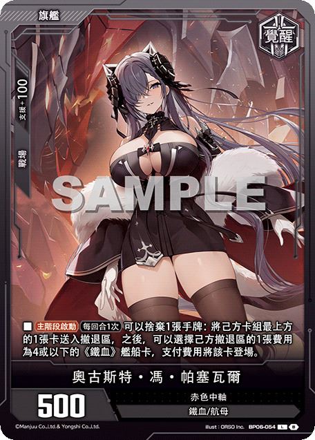 卡牌效果 ■【主階段啟動】【每回合1次】可以捨棄1張手牌:將己方卡組最上方的1張卡送入撤退區,之後,可以選擇己方撤退區的1張費用為4或以下的《鐵血》艦船卡,支付費用將該卡登場。 ■【覺醒】己方的旗艦耐久為1或以下時,將此卡轉為反面。