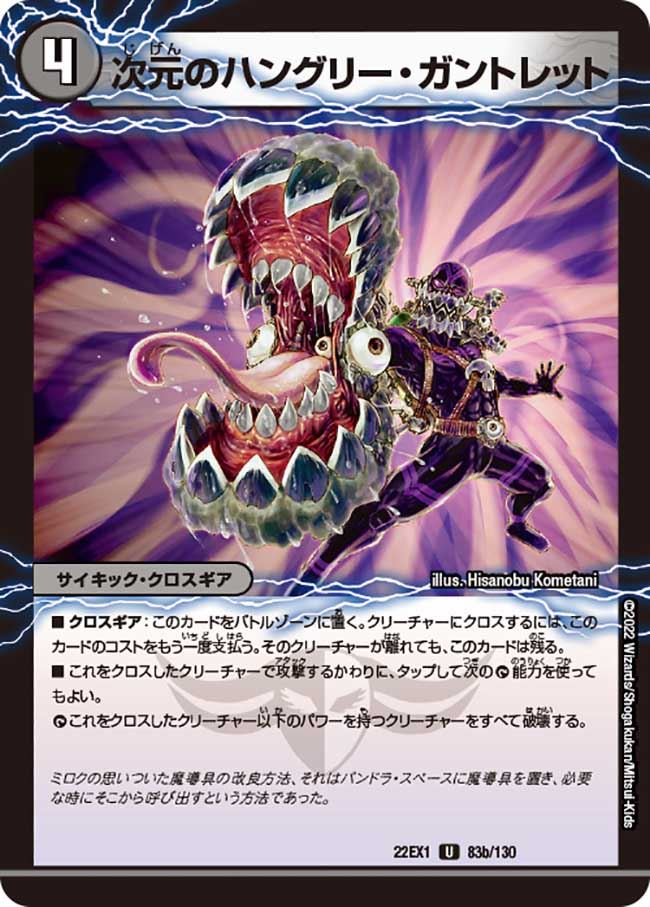 ■當此生物被破壞時,取而代之、將此卡翻至《次元のハングリー・ガントレット》那面、並裝備在1隻我方生物之上。